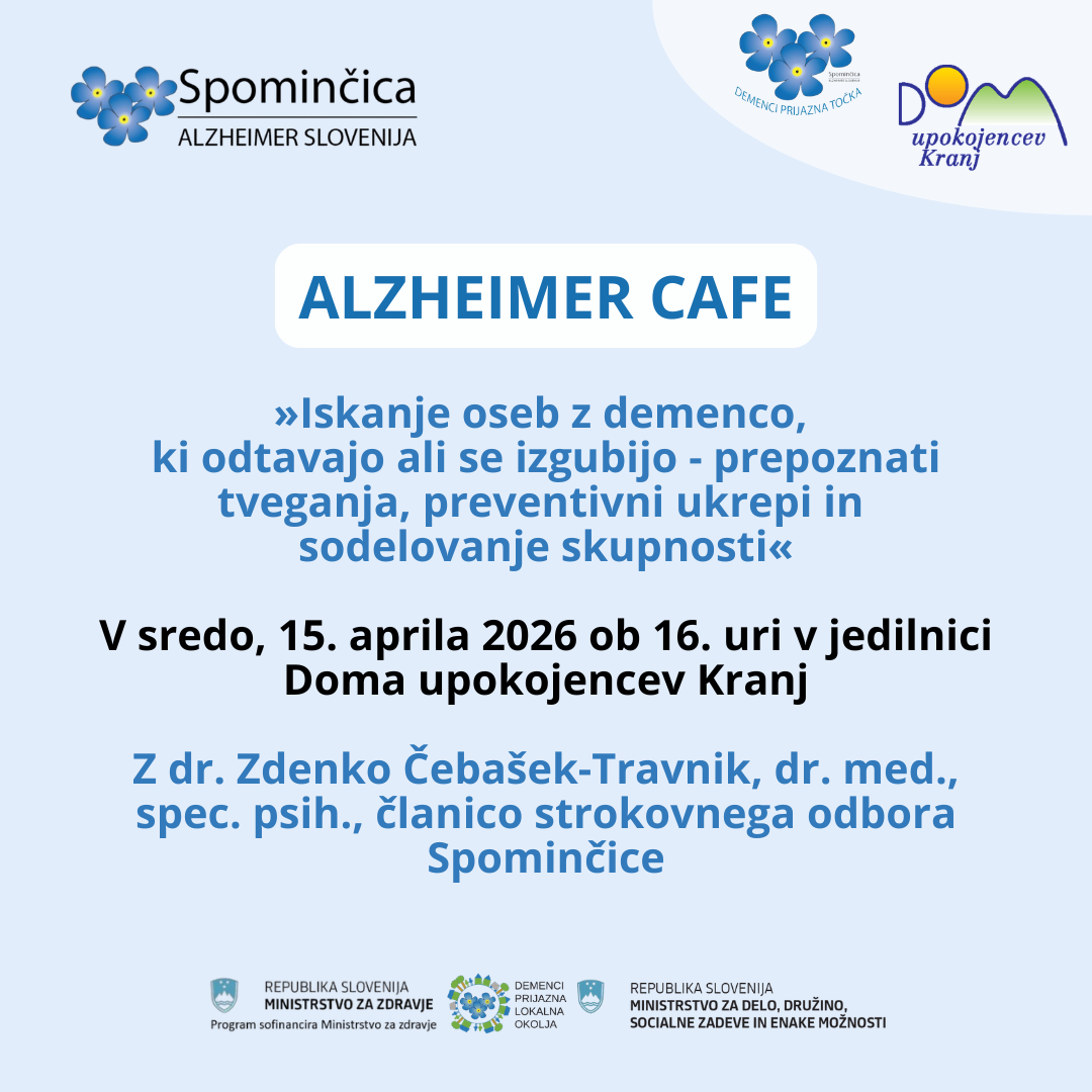 Dom upokojencev Kranj vas v sodelovanju z Spominčico – Alzheimer Slovenija vabi na Alzheimer Cafe, ki bo v sredo, 15. aprila 2026, ob 16.00 v jedilnici Doma upokojencev Kranj.