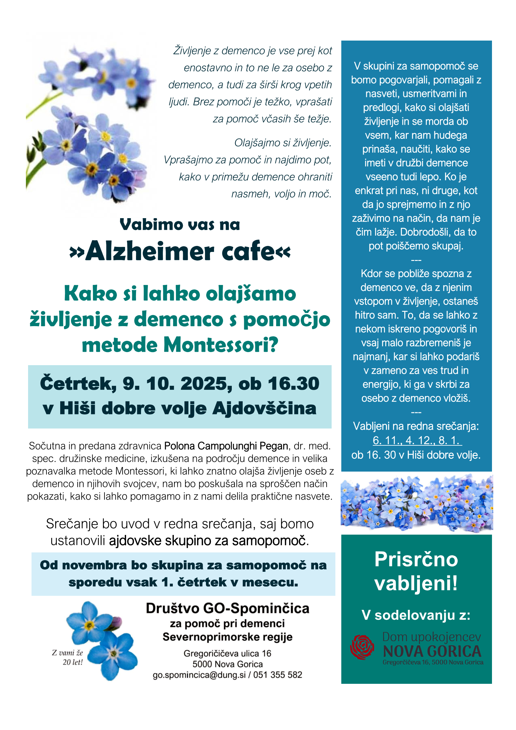 Društvo GO-Spominčica za pomoč pri demenci Severne Primorske regije v sodelovanju z Domom upokojencev Nova Gorica vabi na Alzheimer cafe z naslovom Kako si lahko olajšamo življenje z demenco s pomočjo metode Montessori?, ki bo v četrtek 9. oktobra 2025 ob 16.30 v Hiši dobre volje Ajdovščina.