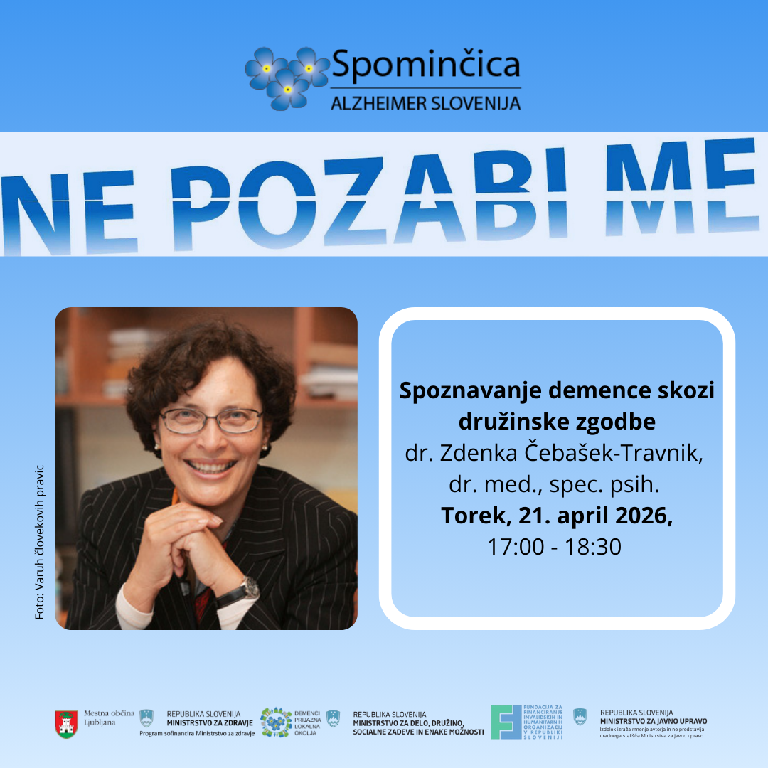 V torek, 21. aprila 2026, bo v sklopu usposabljanja Ne pozabi me predavala dr. Zdenka Čebašek Travnik, dr. med., spec. psih. Vljudno vabljeni, da prisluhnete predavanju z naslovom "Spoznavanje demence skozi družinske zgodbe".