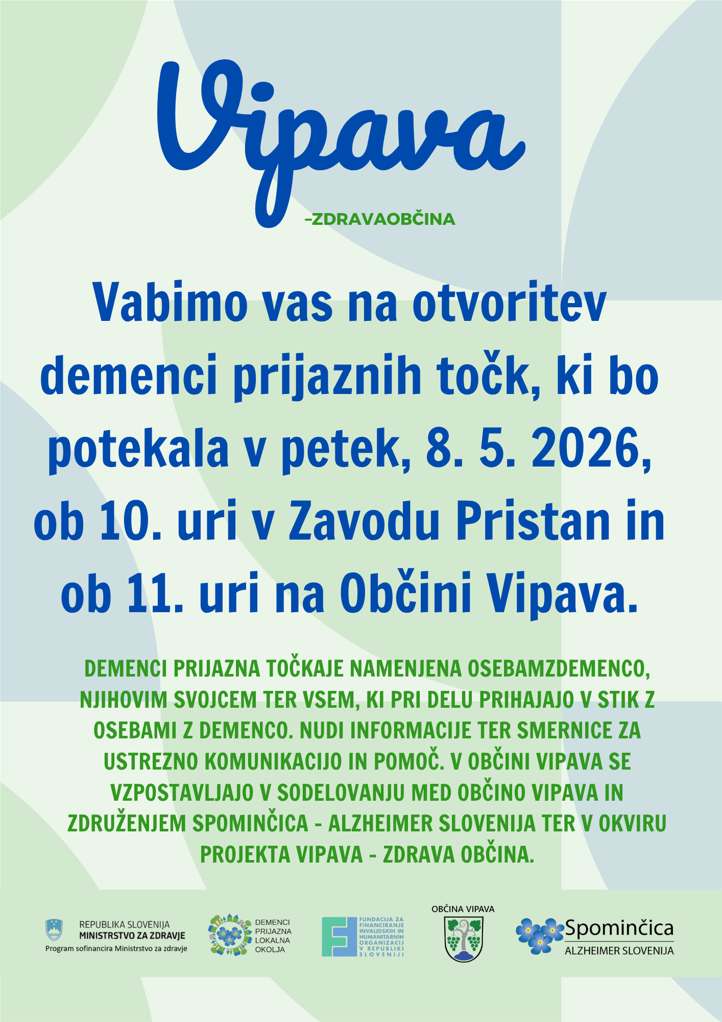 Občina Vipava v sodelovanju z Združenjem Spominčica – Alzheimer Slovenija v okviru projekta Vipava – zdrava občina vabi na odprtje Demenci prijaznih točk.
