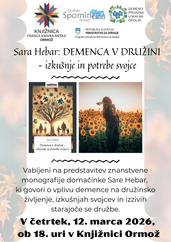 Vabljeni na predstavitev znanstvene monografije »Demenca v družini – izkušnje in potrebe svojcev«, avtorice Sare Hebar, ki bo potekala v četrtek, 12. marca 2026, ob 18. uri v Knjižnici Ormož.
