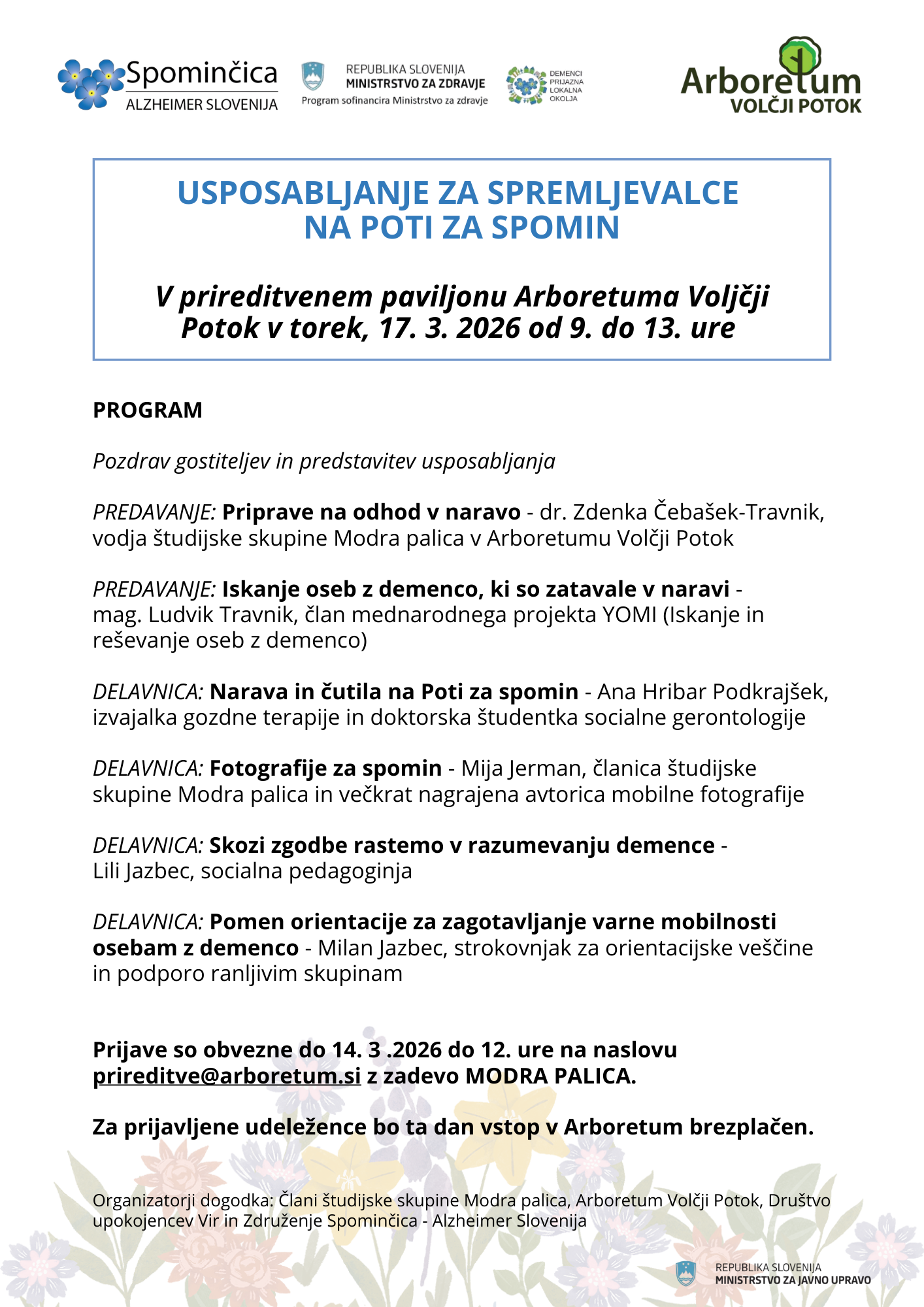Udeležba je brezplačna, potrebna pa je prijava do 14. marca 2026 do 12. ure na naslov prireditve@arboretum.si (v zadevo napišite MODRA PALICA). Za prijavljene udeležence bo ta dan vstop v arboretum brezplačen.