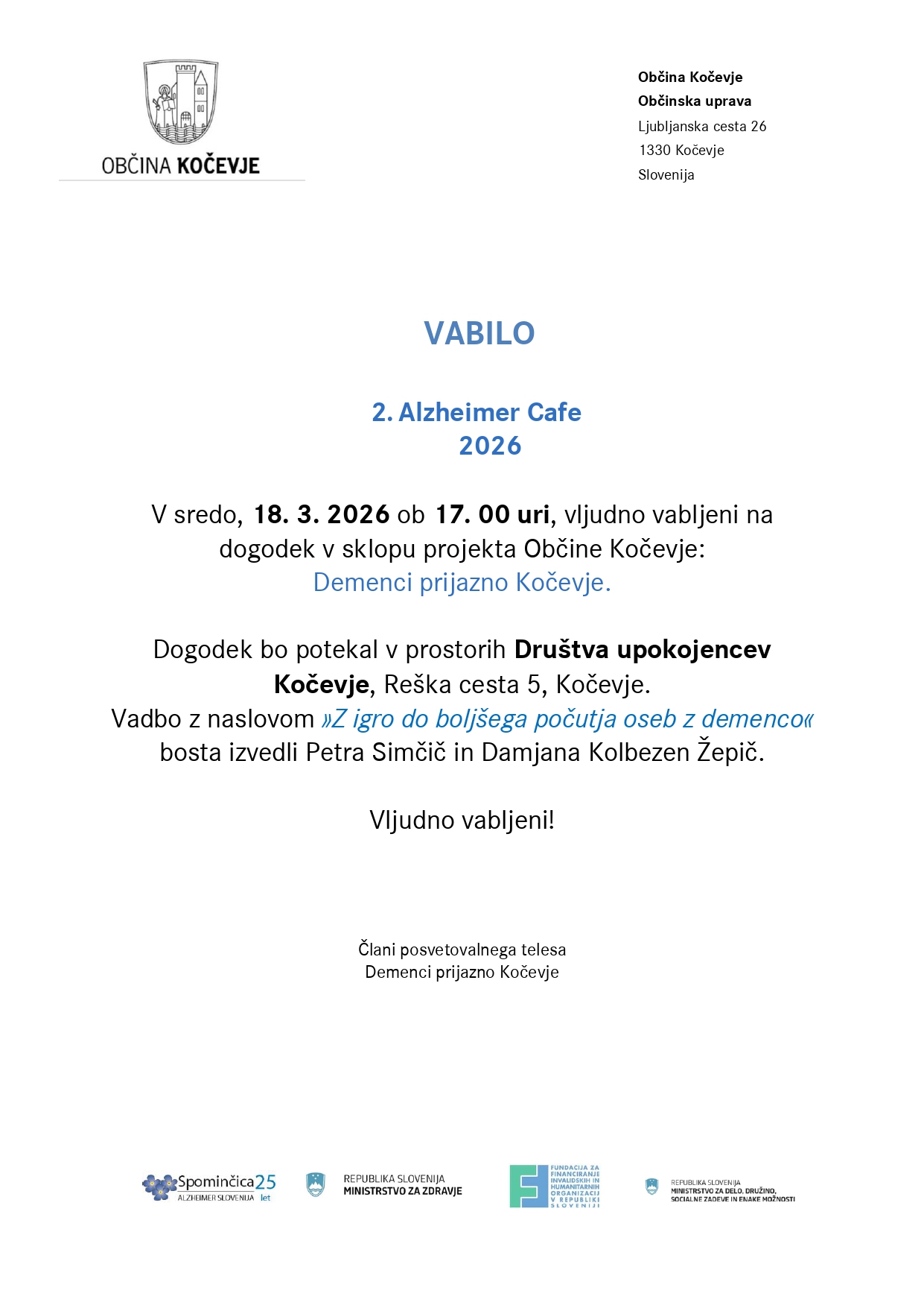 Dogodek poteka v okviru projekta Demenci prijazno Kočevje.