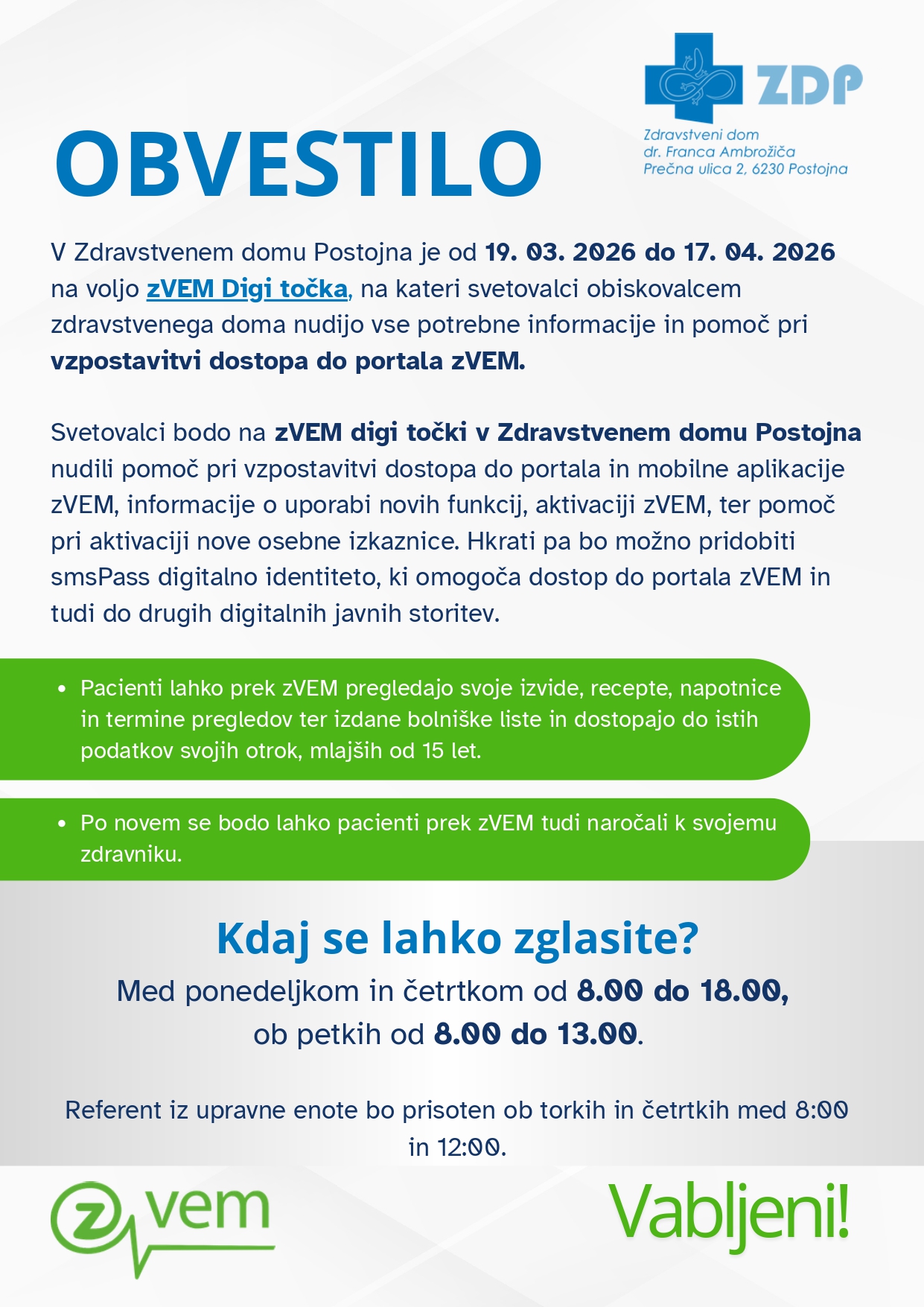 Med 19. 3. 2026 in 17. 4. 2026 bo v zdravstvenem domu vzpostavljena zVEM Digi točka, kjer bodo svetovalci nudili podporo pri vzpostavitvi dostopa do portala in mobilne aplikacije zVEM, razlagi novih funkcionalnosti ter aktivaciji digitalne identitete smsPASS.