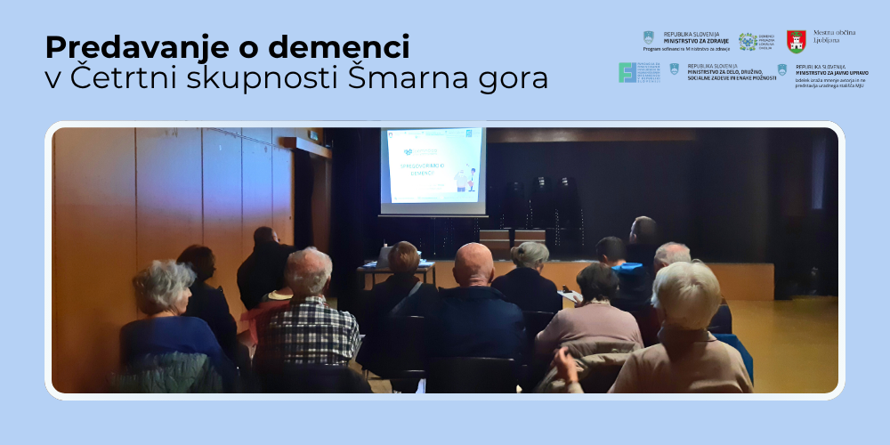 V torek, 4. novembra 2025, je v Četrtni skupnosti Šmarna gora potekalo predavanje "Spregovorimo o demenci". Vodila ga je strokovna delavka Spominčice Urška Telban, prof. slov., org. soc. mreže. Veseli smo številčne udeležbe in vprašanj iz občinstva, zaradi katerih so naša predavanja še bolj bogata in poučna.