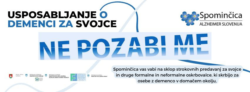 “NE POZABI ME” je sklop strokovnih predavanj za svojce in druge formalne in neformalne oskrbovalce oseb z demenco v domačem okolju, prav tako tudi za vse ostale posameznike, ki se na kakršen koli način srečujete z osebami z demenco. Na sedmih srečanjih bodo predavali priznani strokovnjaki s področja demence. Usposabljanje bo potekalo v živo v prostorih Spominčice in prek spletne platforme Zoom.