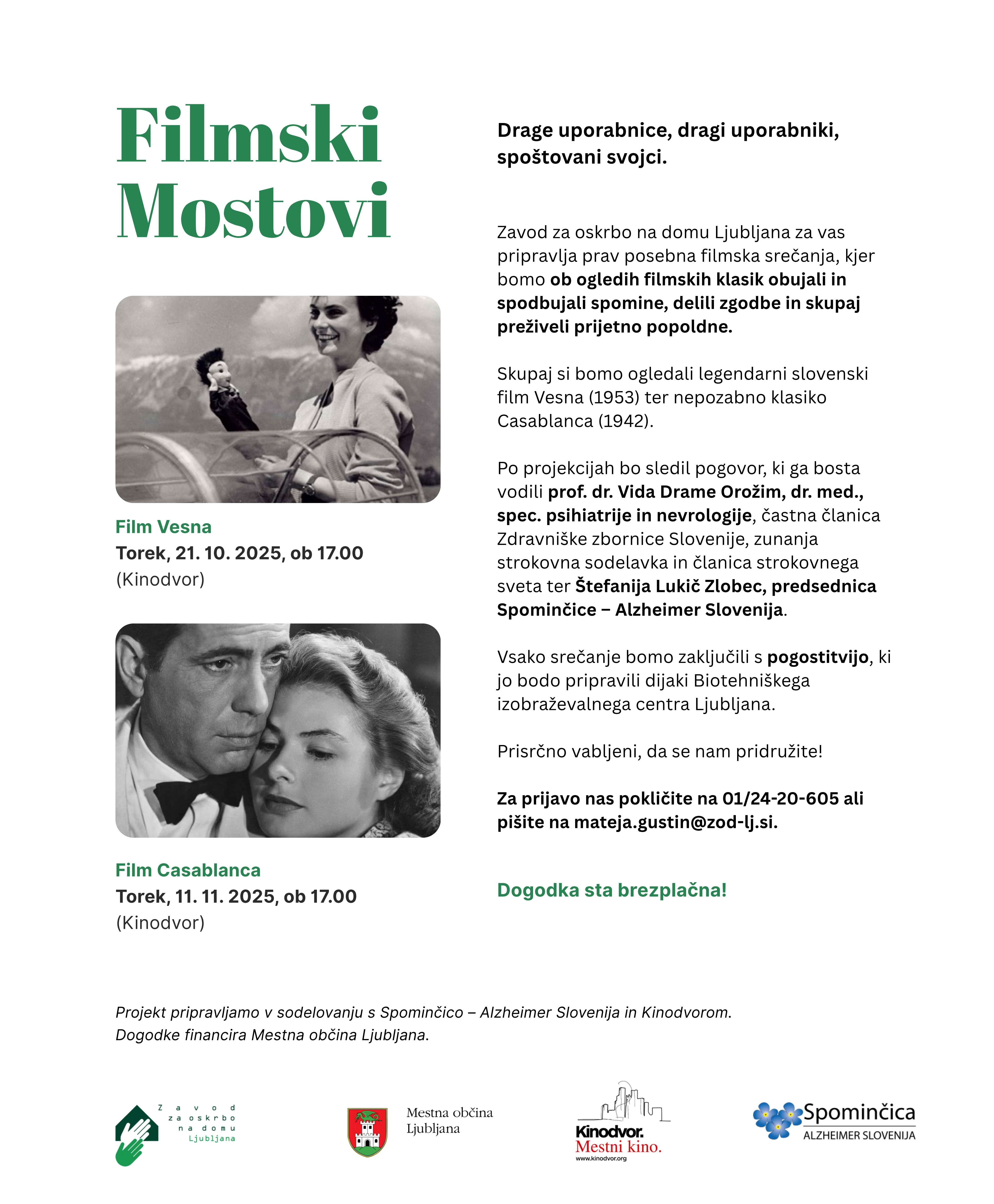 Projekt "FILMSKI MOSTOVI" je kulturni projekt Zavoda za oskrbo na domu Ljubljana, ki je nastal v sodelovanju s Spominčico - Alzheimer Slovenija in Kinodvorom. Starejšim osebam omogoča dostop do kakovostnih umetniških vsebin ter odpira prostor za povezovanje, pogovor in čustveno odzivnost. V središču programa so izbrane filmske projekcije v Kinodvoru, ki nagovarjajo spomine, kulturno identiteto in izkušnjo generacije, ki je pogosto izključena iz sodobnega kulturnega dogajanja.
