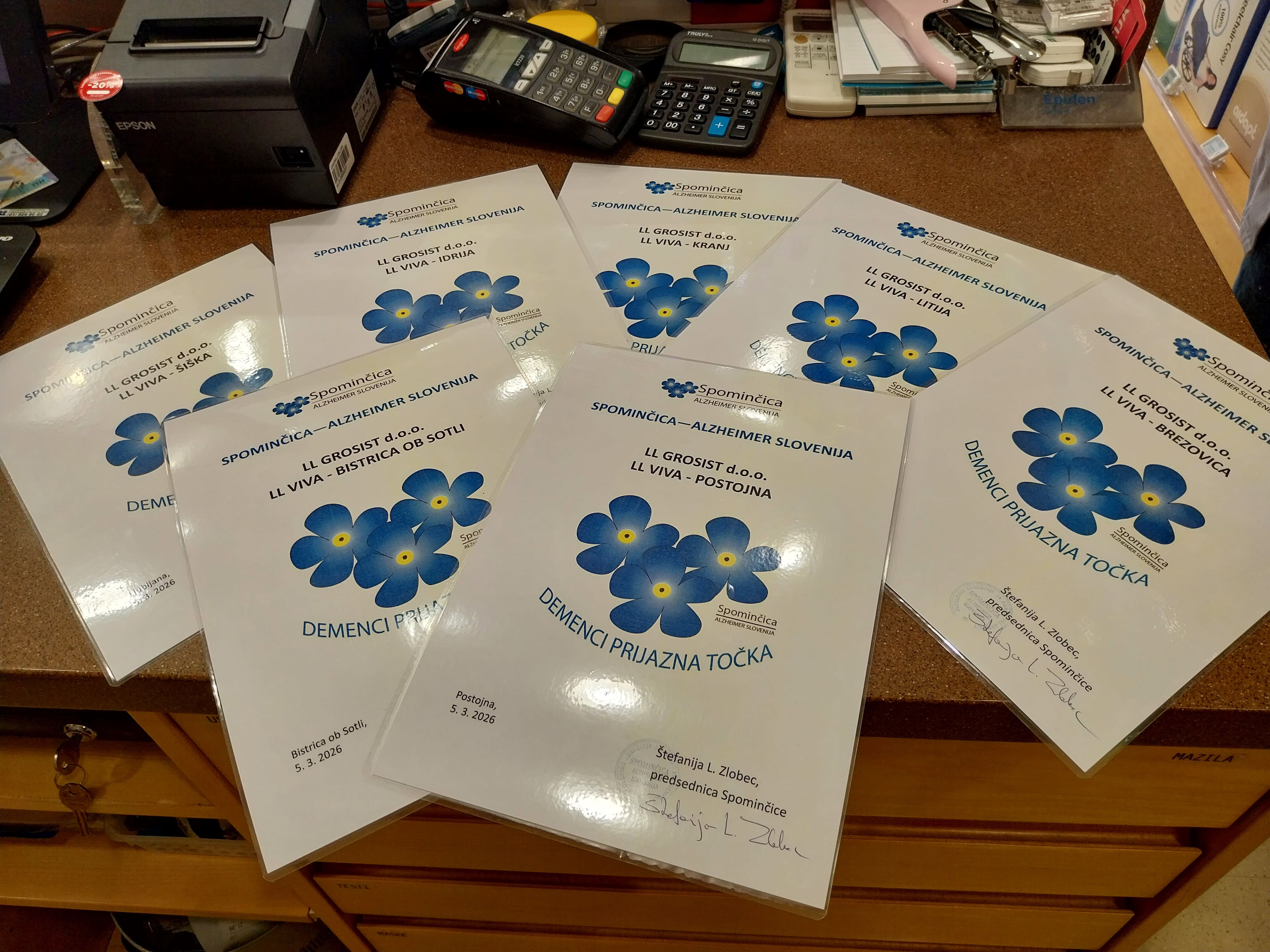 Certifikate novim Demenci prijaznim točkam je izročila Štefanija L. Zlobec, predsednica Spominčice – Alzheimer Slovenija. Ob tej priložnosti so bile prisotne tudi predstavnica vodstva podjetja LL Grosist ga. Nataša Šinkovec ter vodstva in zaposlenih v poslovalnicah, ki s tem pomembnim korakom izkazujejo svojo družbeno odgovornost in podporo osebam z demenco ter njihovim svojcem.