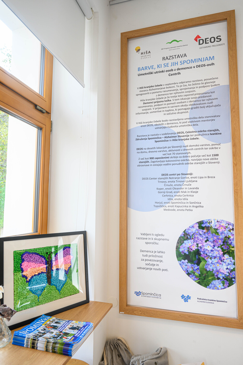 V Hiši kranjske čebele v Višnji Gori je v torek, 16. septembra 2025, potekalo odprtje 4. razstave likovnih del oseb z demenco, ki ustvarjajo v okviru likovne terapije v domovih za starejše skupine DEOS, Celostna oskrba starejših. Razstava »Barve, ki se jih spominjam« je posvečena mesecu Alzheimerjeve bolezni in poudarja pomen ustvarjanja vključujočega, razumevajočega in solidarnega okolja za osebe z demenco.