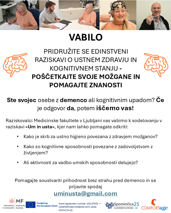 Raziskovalci Medicinske fakultete Univerze v Ljubljani vabijo k sodelovanju v raziskavi »Um in usta«, ki poteka v okviru evropskega projekta COMFORTage. Preučujejo povezavo med ustnim zdravjem, kognitivnimi sposobnostmi in tveganjem za razvoj demence.