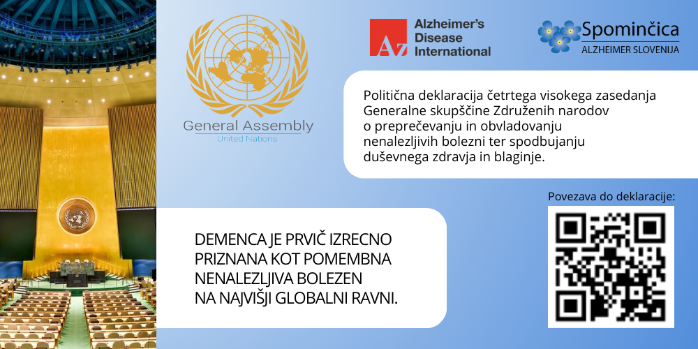 Države članice Združenih narodov (ZN) so 15. decembra 2025 v New Yorku sprejele deklaracijo četrtega visokega zasedanja Generalne skupščine o preprečevanju in obvladovanju kroničnih nenalezljivih bolezni ter o spodbujanju duševnega zdravja – dokument demenco prvič izrecno priznava kot pomembno kronično nenalezljivo bolezen.