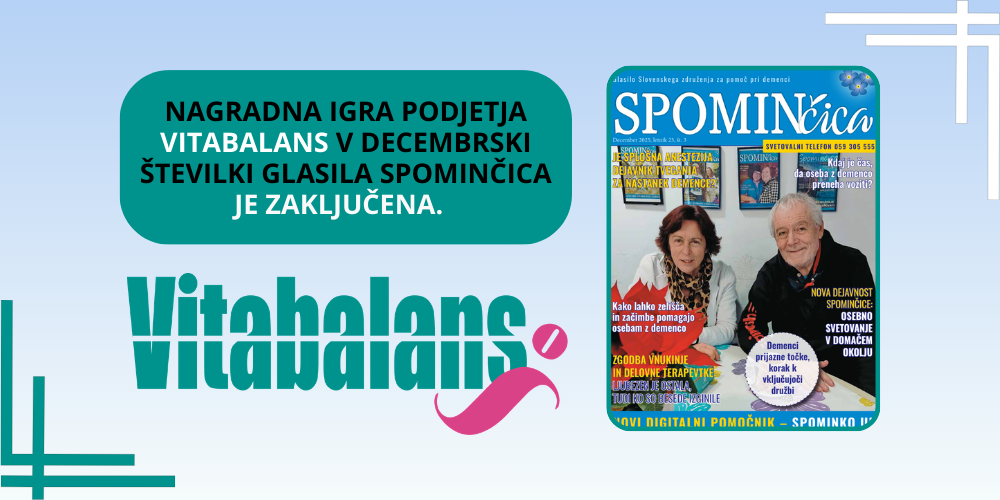 Za sodelovanje pri nagradni igri v decembrski številki Glasila Spominčica se zahvaljujemo podjetju Vitabalans, finskemu farmacevtskemu podjetju, katerega izdelki slovijo po visoki kakovosti in so na voljo v lekarnah, specializiranih prodajalnah ter spletnih lekarnah. Podjetje Vitabalans je omogočilo izvedbo nagradnega žrebanja.
