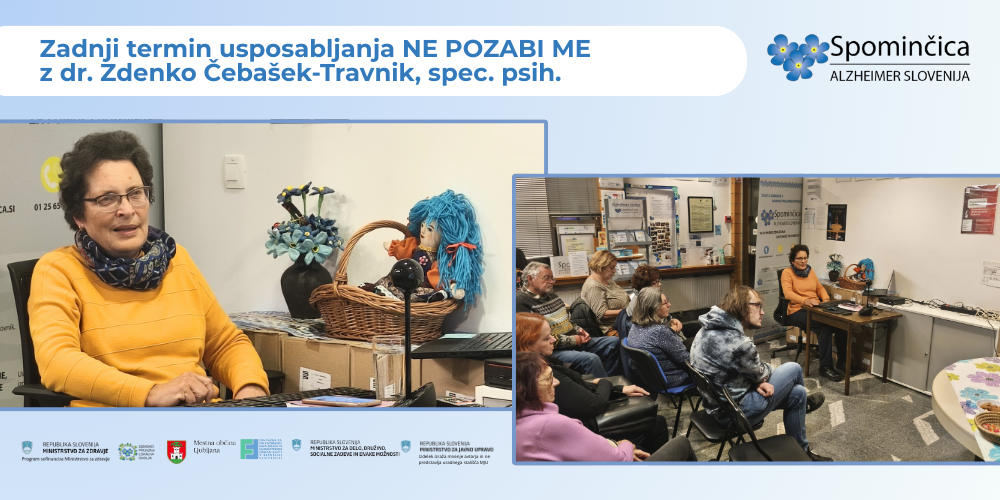 V torek, 16. decembra 2025, je v prostorih Spominčice in preko spletnega orodja Zoom potekalo zaključno predavanje jesenskega usposabljanja "Ne pozabi me". Vodila ga je dr. Zdenka Čebašek-Travnik, specialistka psihiatrije ter članica strokovnega in nadzornega odbora Spominčice.